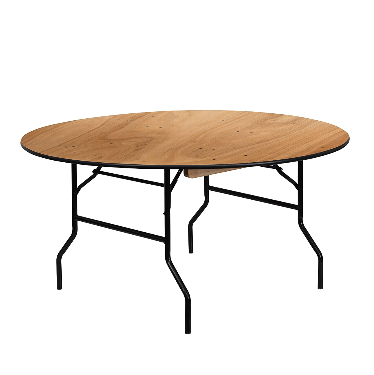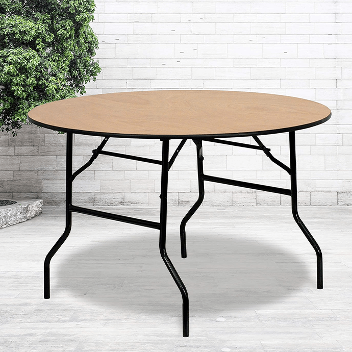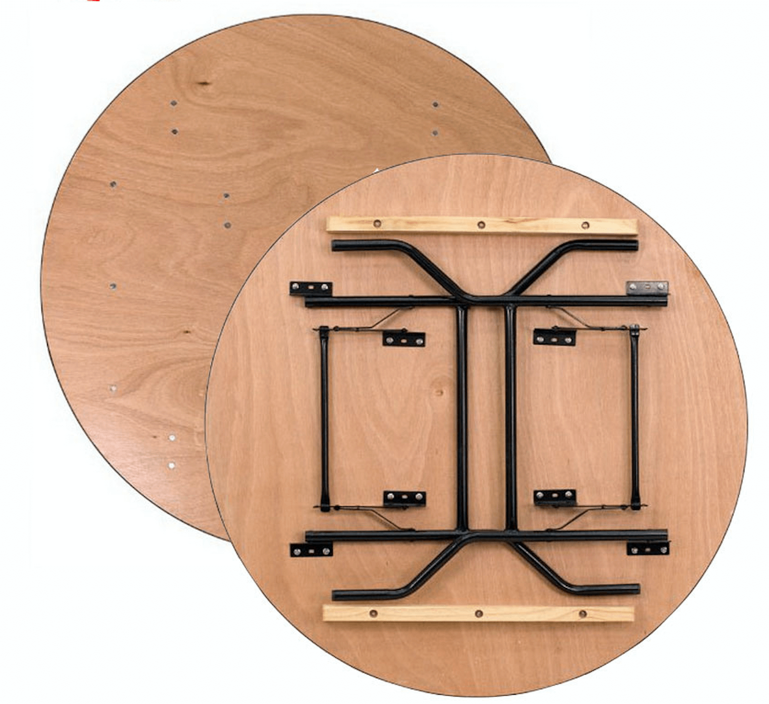 Solidny, trwały i wysokiej jakości okrągły stół ze składanymi nogami ze stali i drewnianym blatem. Nogi stołu blokują się, zapewniając stabilność. Nogi wykonane są z wysokiej jakości, grubej stali, pomalowanej na czarno. Dzięki łatwo składanym nogom, stoły są bardzo łatwe do przechowywania. Stoły można układać jeden na drugim, co pozwala zaoszczędzić jeszcze więcej miejsca podczas przechowywania. Po zakupieniu tych stołów możesz szybko ustawić je w dowolnym pomieszczeniu i stworzyć wspaniałą strefę wypoczynkową dla swoich gości. Stoły te cieszą się dużą popularnością w gospodarstwach agroturystycznych, na bankietach, w hotelach i na imprezach. Wynajmujemy te stoły od wielu lat – gwarantujemy ich jakość.