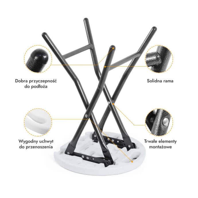 Rozłożenie taboretu zajmie zaledwie chwilę – wystarczy go tylko rozłożyć. Jest to praktyczne rozwiązanie na eventy, targi lub inne sytuacje, w których potrzebne jest szybkie i niezawodne rozwiązanie w zakresie miejsc siedzących.