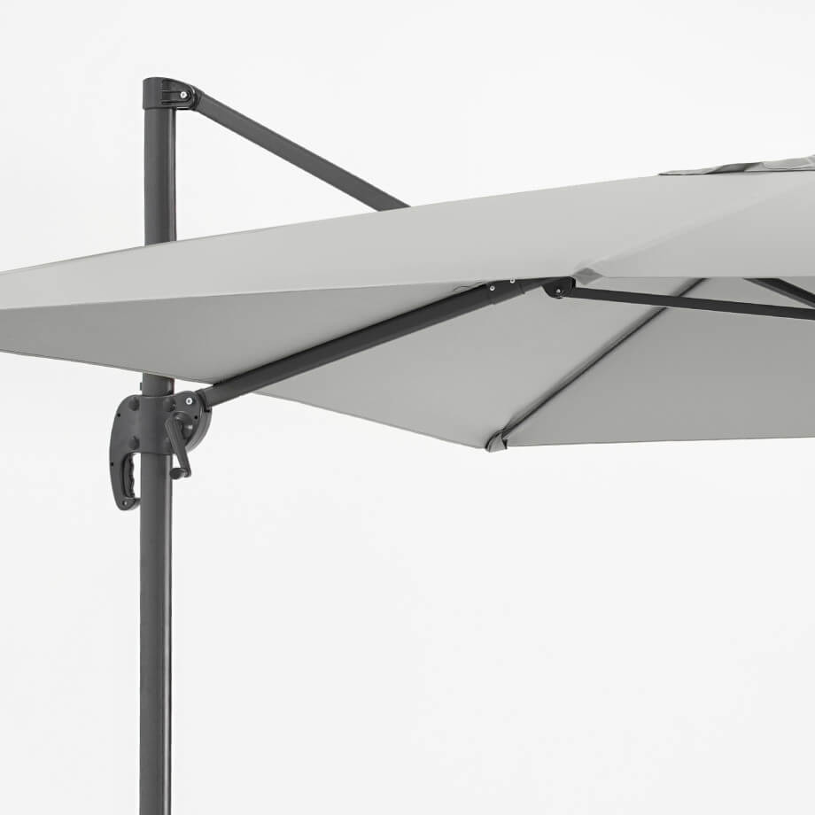 - Wymiary parasola – 2,7x2,7 m – idealne zakrywa, sprawdzi się zarówno na prywatnym tarasie na świeżym powietrzu, jak i kawiarni lub powierzchni handlowej.