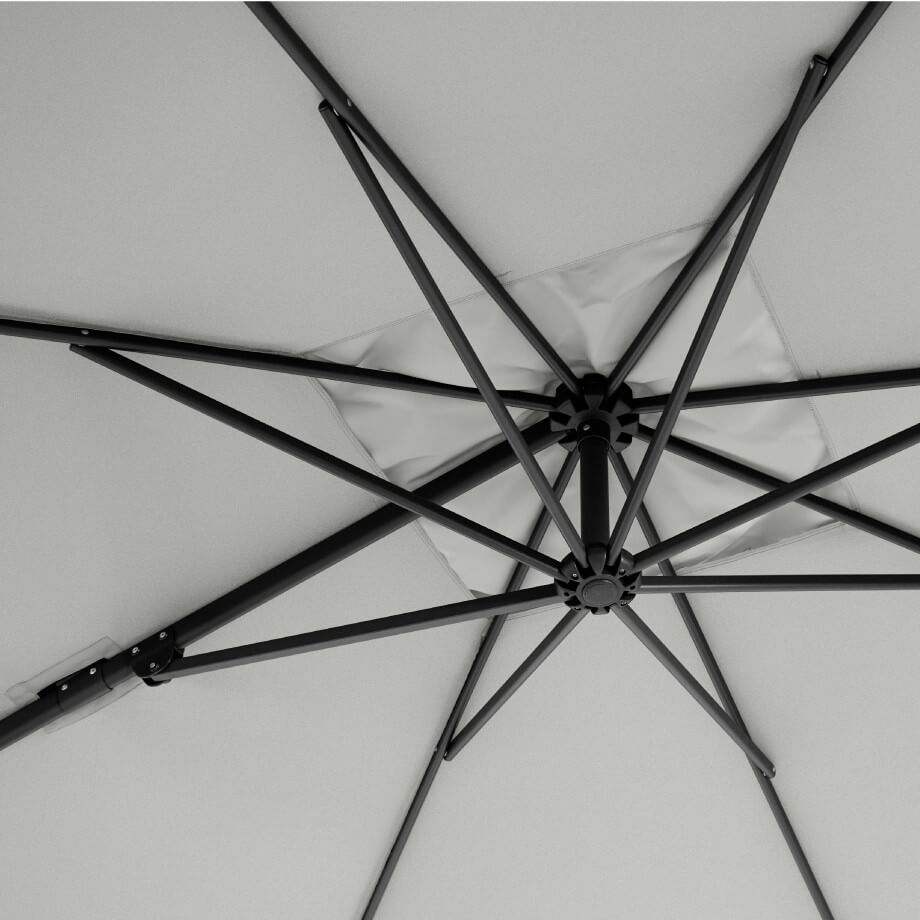 Obrót wokół osi 360° – naciskając stopą dźwignię znajdującą się na dole podstawy, możesz obrócić cały parasol wokół osi stojaka o 360°. Dzięki temu będziesz mógł zmieniać obszar objęty parasolem i położenie cienia, bez konieczności przesuwania parasola z jednego miejsca na drugie.