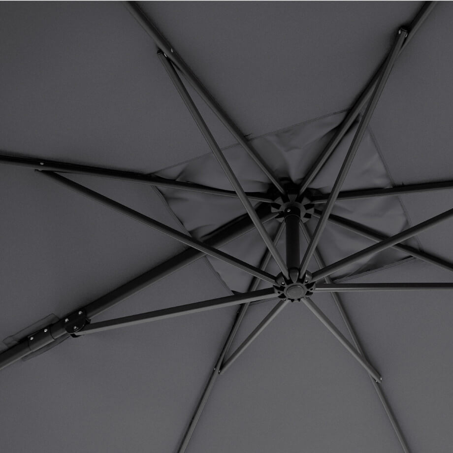 - Obrót wokół osi 360° – naciskając stopą dźwignię znajdującą się na dole podstawy, możesz obrócić cały parasol wokół osi stojaka o 360°. Dzięki temu będziesz mógł zmieniać obszar objęty parasolem i położenie cienia, bez konieczności przesuwania parasola z jednego miejsca na drugie.