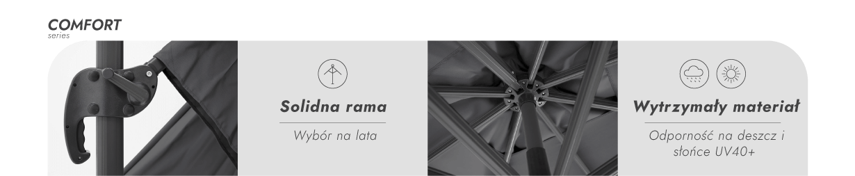 ZeltPro Comfort należy do wyższej klasy serii Comfort – jest technologicznie zaawansowanym parasolem zaprojektowanym do intensywnego użytkowania i dla wymagających użytkowników. Konstrukcja wykonana jest z solidnych materiałów i niezawodnych łączników, co gwarantuje długotrwałą stabilność nawet w trudnych warunkach atmosferycznych. Wysokiej jakości tkanina UV40+ jest odporna nie tylko na promienie słoneczne, ale również na deszcz, a wygodny mechanizm z funkcją ustawiania w pionie pozwala na szybkie dopasowanie osłony do zmieniającej się pozycji. Każdy szczegół – od szwów po uchwyt do ustawiania – został zaprojektowany z myślą o codziennym, bezproblemowym użytkowaniu. Jest to kolekcja skupiona na trwałości, funkcjonalności i estetyce przy jednoczesnym zachowaniu zrównoważonej ceny.