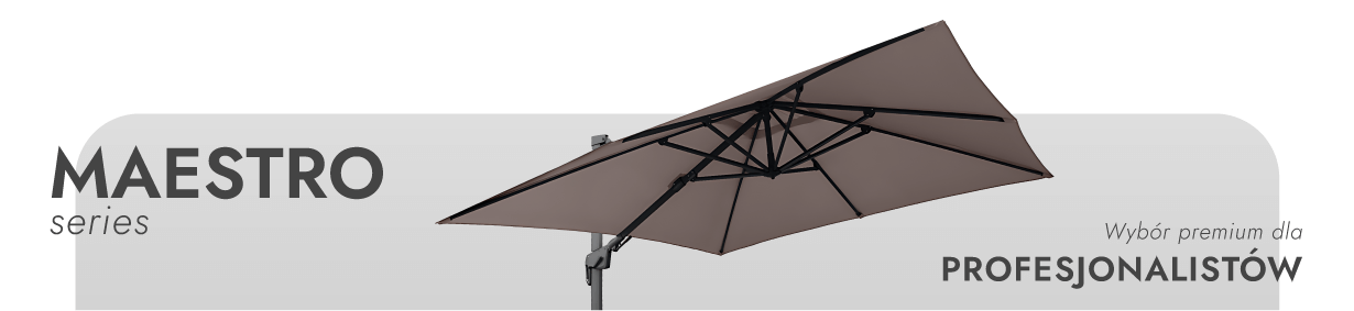 ZeltPro Maestro to najbardziej luksusowa kolekcja parasoli ZeltPro. To funkcjonalny i solidnie wykonany parasol ogrodowy, wyprodukowany z materiałów najwyższej jakości. Solidna aluminiowa rama gwarantuje długotrwałe użytkowanie i odporność na warunki atmosferyczne, natomiast wysokiej jakości tkanina UV50+ chroni przed słońcem i deszczem, zachowując estetyczny wygląd nawet po długim użytkowaniu. Dzięki potrójnemu systemowi regulacji – zarówno nachylenia pionowego, obrotu poziomego, jak i obrotu o 360°, model ten umożliwia precyzyjne dopasowanie się do położenia słońca o różnych porach dnia. Pomimo szerokiego zakresu regulacji, konstrukcja pozostaje stabilna i zrównoważona, dzięki czemu nadaje się zarówno do użytku na prywatnych dziedzińcach, jak i do profesjonalnego użytku na tarasach lub podczas imprez.