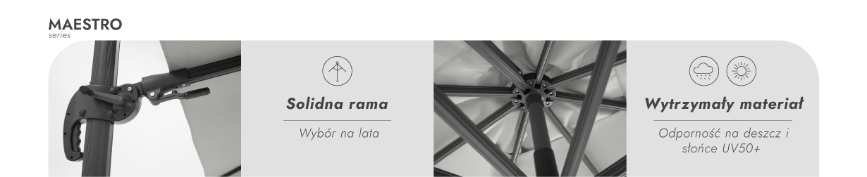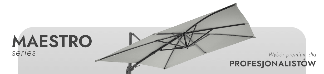 ZeltPro Maestro to najbardziej luksusowa kolekcja parasoli ZeltPro. To funkcjonalny i solidnie wykonany parasol ogrodowy, wyprodukowany z materiałów najwyższej jakości. Solidna aluminiowa rama gwarantuje długotrwałe użytkowanie i odporność na warunki atmosferyczne, natomiast wysokiej jakości tkanina UV50+ chroni przed słońcem i deszczem, zachowując estetyczny wygląd nawet po długim użytkowaniu. Dzięki potrójnemu systemowi regulacji – zarówno nachylenia pionowego, obrotu poziomego, jak i obrotu o 360°, model ten umożliwia precyzyjne dopasowanie się do położenia słońca o różnych porach dnia. Pomimo szerokiego zakresu regulacji, konstrukcja pozostaje stabilna i zrównoważona, dzięki czemu nadaje się zarówno do użytku na prywatnych dziedzińcach, jak i do profesjonalnego użytku na tarasach lub podczas imprez.