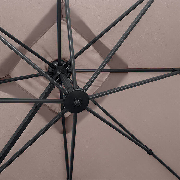 • Wymiary parasola – 2,7x2,7 m – idealne zakrywa, sprawdzi się zarówno na prywatnym tarasie na świeżym powietrzu, jak i kawiarni lub powierzchni handlowej.
