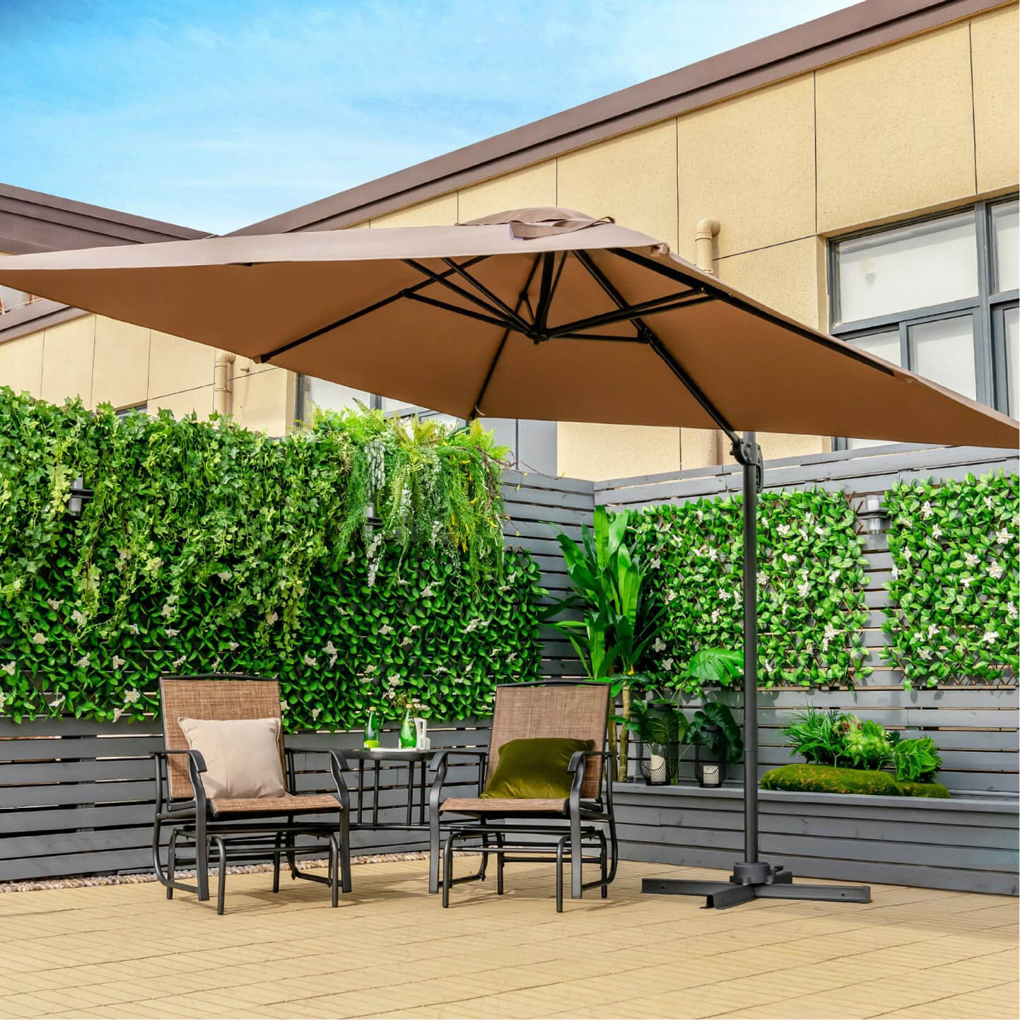 - Wymiary parasola – 2,7x2,7 m – idealne zakrywa, sprawdzi się zarówno na prywatnym tarasie na świeżym powietrzu, jak i kawiarni lub powierzchni handlowej.