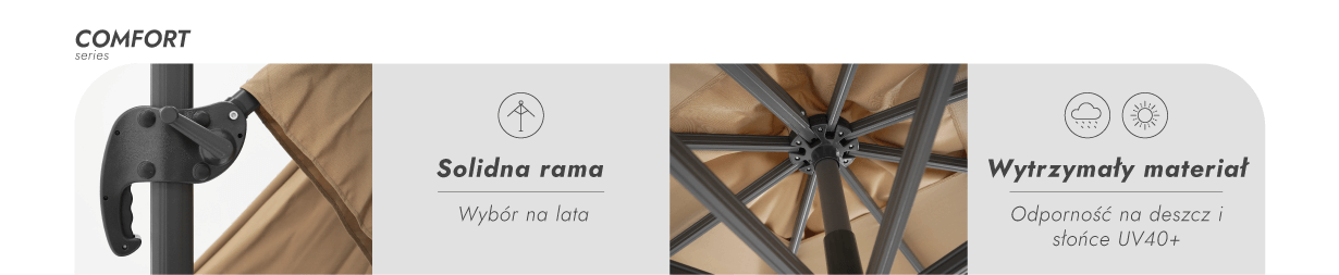 ZeltPro Comfort należy do wyższej klasy serii Comfort – jest technologicznie zaawansowanym parasolem zaprojektowanym do intensywnego użytkowania i dla wymagających użytkowników. Konstrukcja wykonana jest z solidnych materiałów i niezawodnych łączników, co gwarantuje długotrwałą stabilność nawet w trudnych warunkach atmosferycznych. Wysokiej jakości tkanina UV40+ jest odporna nie tylko na promienie słoneczne, ale również na deszcz, a wygodny mechanizm z funkcją ustawiania w pionie pozwala na szybkie dopasowanie osłony do zmieniającej się pozycji. Każdy szczegół – od szwów po uchwyt do ustawiania – został zaprojektowany z myślą o codziennym, bezproblemowym użytkowaniu. Jest to kolekcja skupiona na trwałości, funkcjonalności i estetyce przy jednoczesnym zachowaniu zrównoważonej ceny.