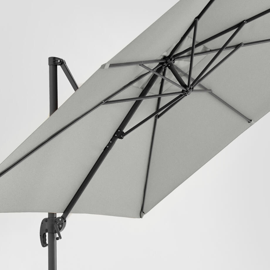 - Wymiary parasola – 2,7x2,7 m – idealne zakrywa, sprawdzi się zarówno na prywatnym tarasie na świeżym powietrzu, jak i kawiarni lub powierzchni handlowej.