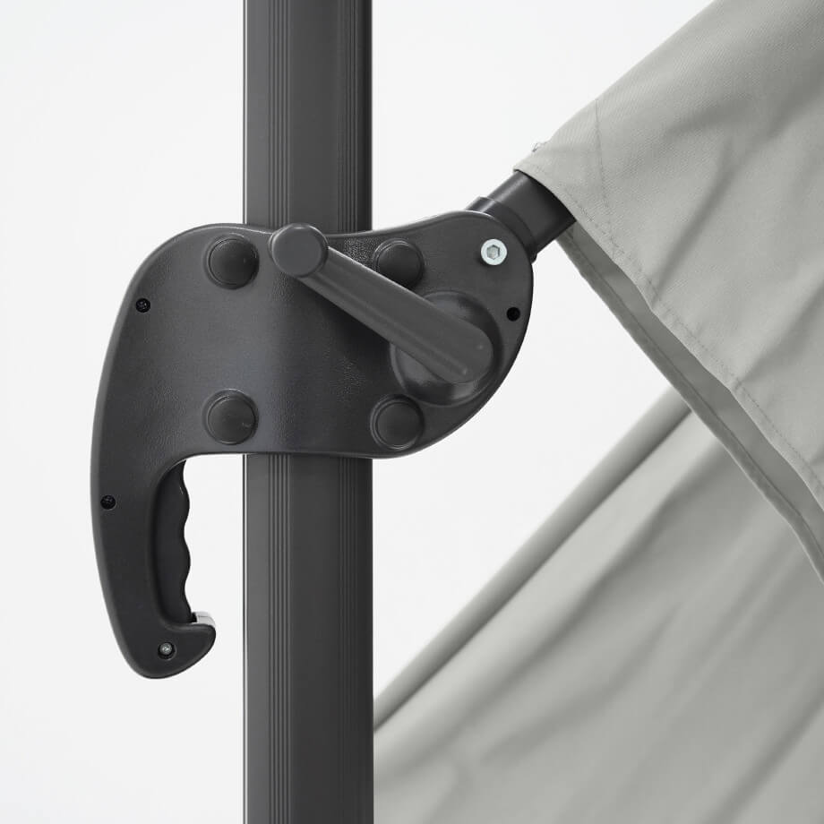 Obrót wokół osi 360° – naciskając stopą dźwignię znajdującą się na dole podstawy, możesz obrócić cały parasol wokół osi stojaka o 360°. Dzięki temu będziesz mógł zmieniać obszar objęty parasolem i położenie cienia, bez konieczności przesuwania parasola z jednego miejsca na drugie.