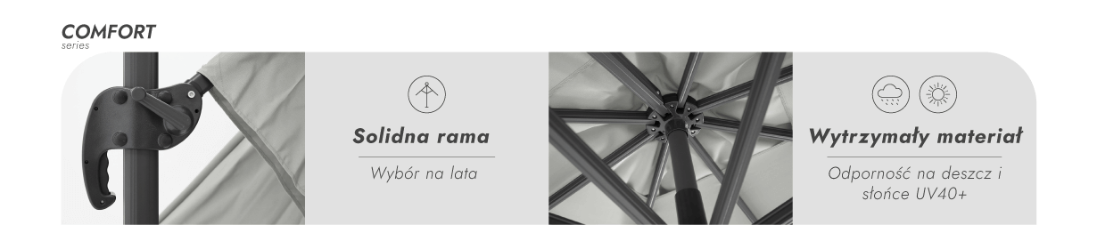 ZeltPro Comfort należy do wyższej klasy serii Comfort – jest technologicznie zaawansowanym parasolem zaprojektowanym do intensywnego użytkowania i dla wymagających użytkowników. Konstrukcja wykonana jest z solidnych materiałów i niezawodnych łączników, co gwarantuje długotrwałą stabilność nawet w trudnych warunkach atmosferycznych. Wysokiej jakości tkanina UV40+ jest odporna nie tylko na promienie słoneczne, ale również na deszcz, a wygodny mechanizm z funkcją ustawiania w pionie pozwala na szybkie dopasowanie osłony do zmieniającej się pozycji. Każdy szczegół – od szwów po uchwyt do ustawiania – został zaprojektowany z myślą o codziennym, bezproblemowym użytkowaniu. Jest to kolekcja skupiona na trwałości, funkcjonalności i estetyce przy jednoczesnym zachowaniu zrównoważonej ceny.
