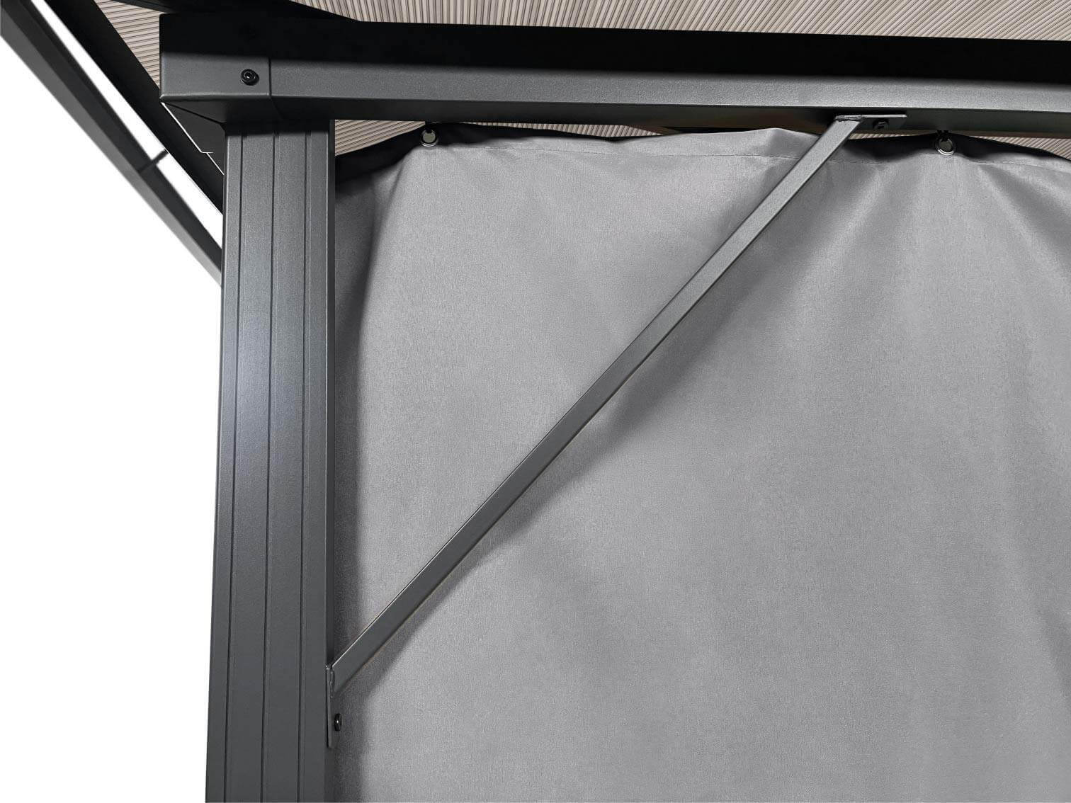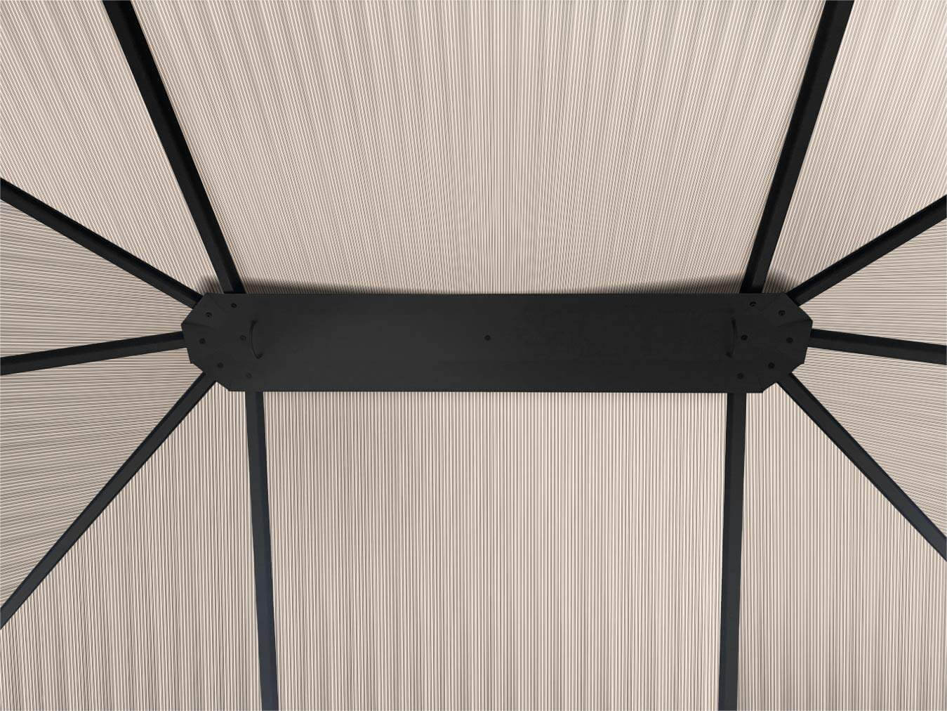 • Dach: twarde płyty z poliwęglanu  – 100% wodoodporne, odporne na promieniowanie UV, przepuszczają naturalne światło i tworzą przytulny, nieoślepiający cień.