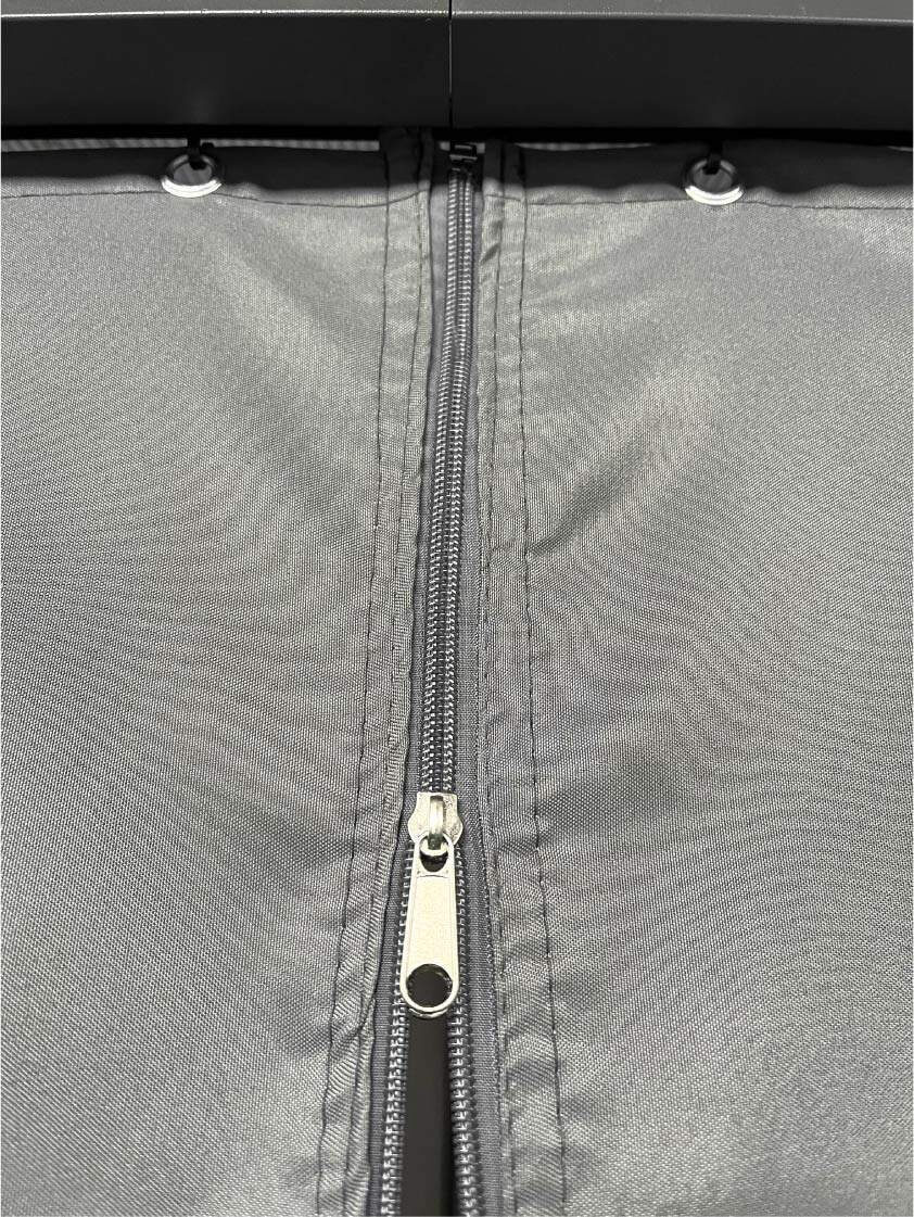 • Ściany: propoliester z dodatkową powłoką PA ((160 g/m²). Każda ściana jest zdejmowana i ma zamek błyskawiczny, dlatego możesz całkowicie zamknąć lub otworzyć przestrzeń, zależnie od potrzeb.