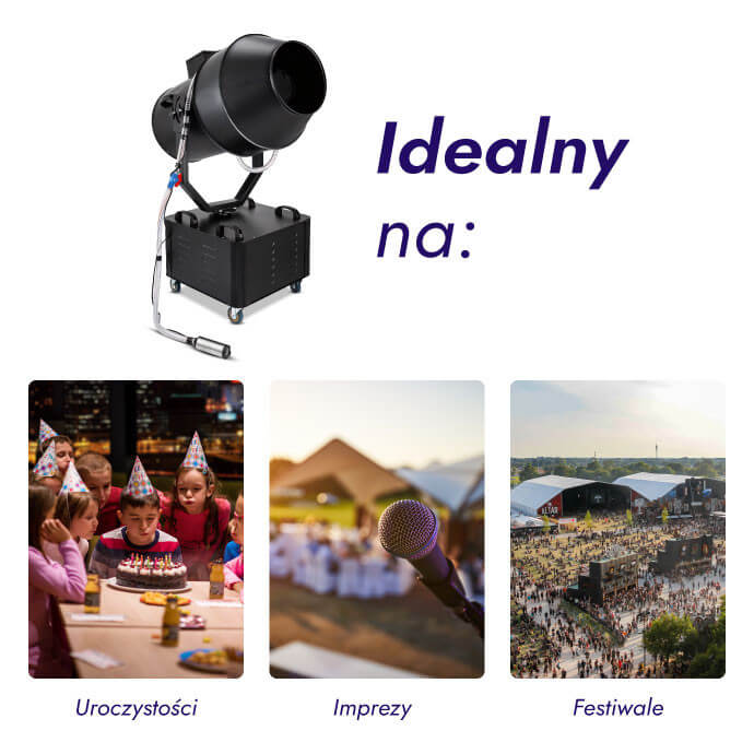 Ta armatka do piany doskonale sprawdzi się zarówno na dużych, jak i małych imprezach. Dzięki silnikowi o mocy 3 kW, maszyna do piany jest w stanie wydmuchać duże ilości piany i pokryć nią dziesiątki osób w ciągu zaledwie kilku minut.